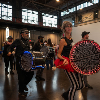 Born from the pandemic, Providence Drum Troupe is a group filled with musicians, acrobats, flow arts life-size alien puppets, hoopers, lasers and dancers from near and far who create funky beats with positive interactive energy demonstrating that living in harmony with one another is not an antiquated notion.